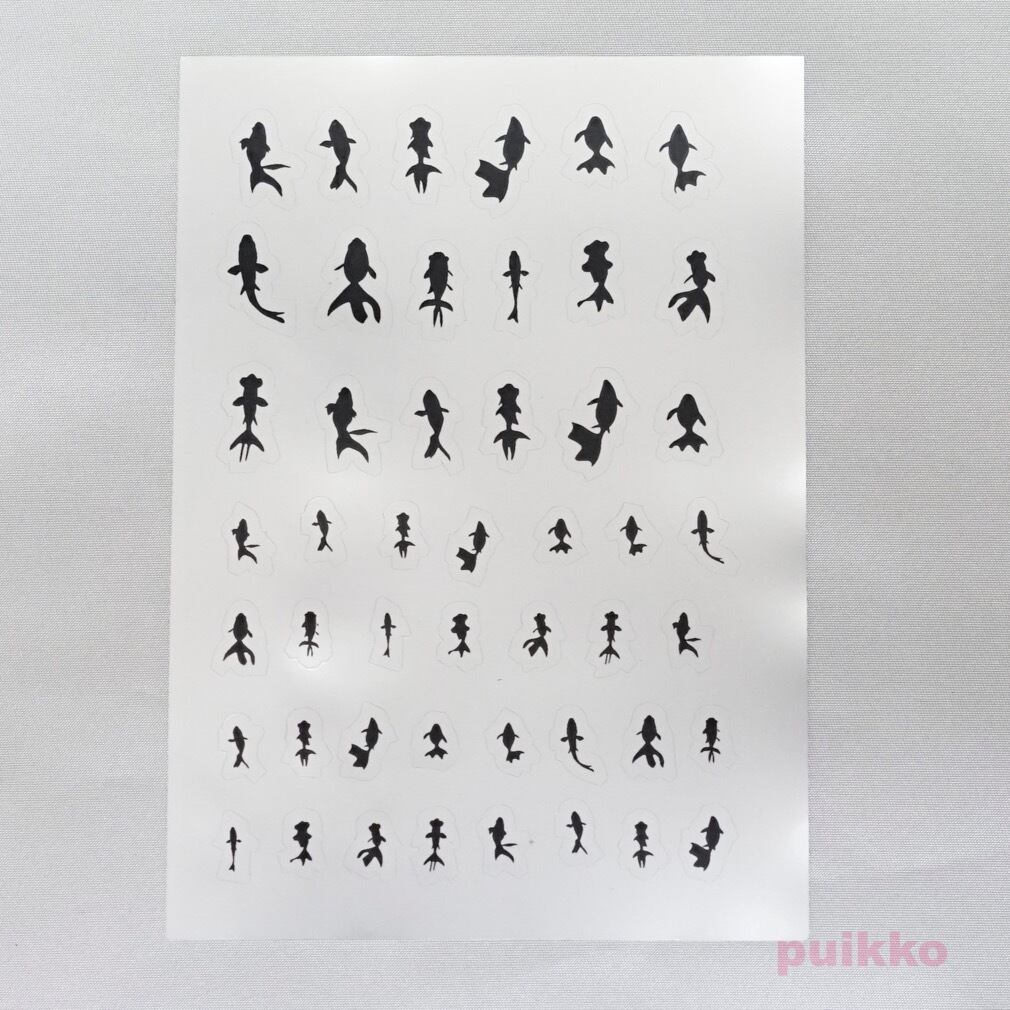 金魚のシルエットイラストを透明シールにモノクロで印刷し、ハーフカットを入れました。