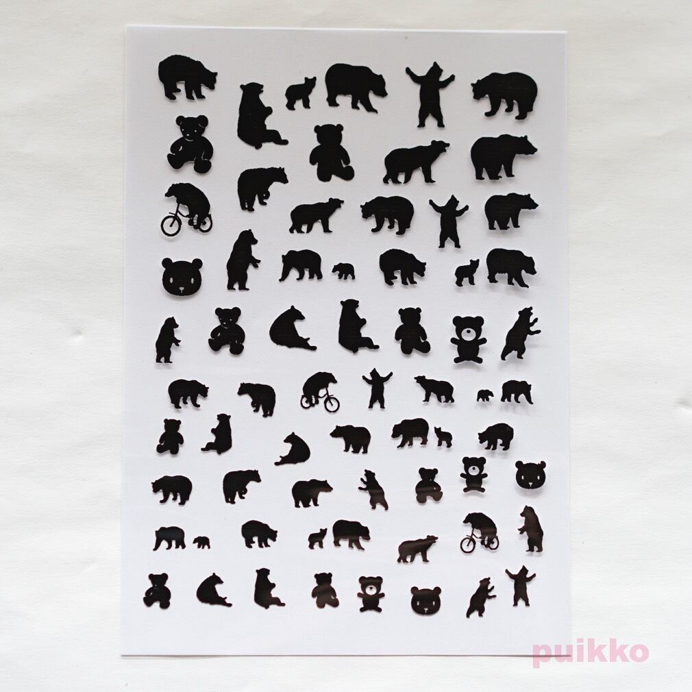 リアルなクマやデフォルメしたクマ、ぬいぐるみのクマのシルエットなど17種をサイズにバリエーションつけて収録。